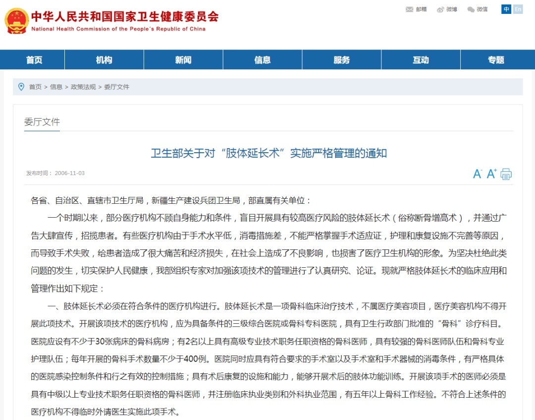 同时,通知还明确规定,肢体延长术不属医疗美容项目,医疗美容机构不得开展此项技术。开展该项技术的医疗机构,应为具备条件的三级综合医院或骨科专科医院,具有卫生行政部门批准的“骨科”诊疗科目。